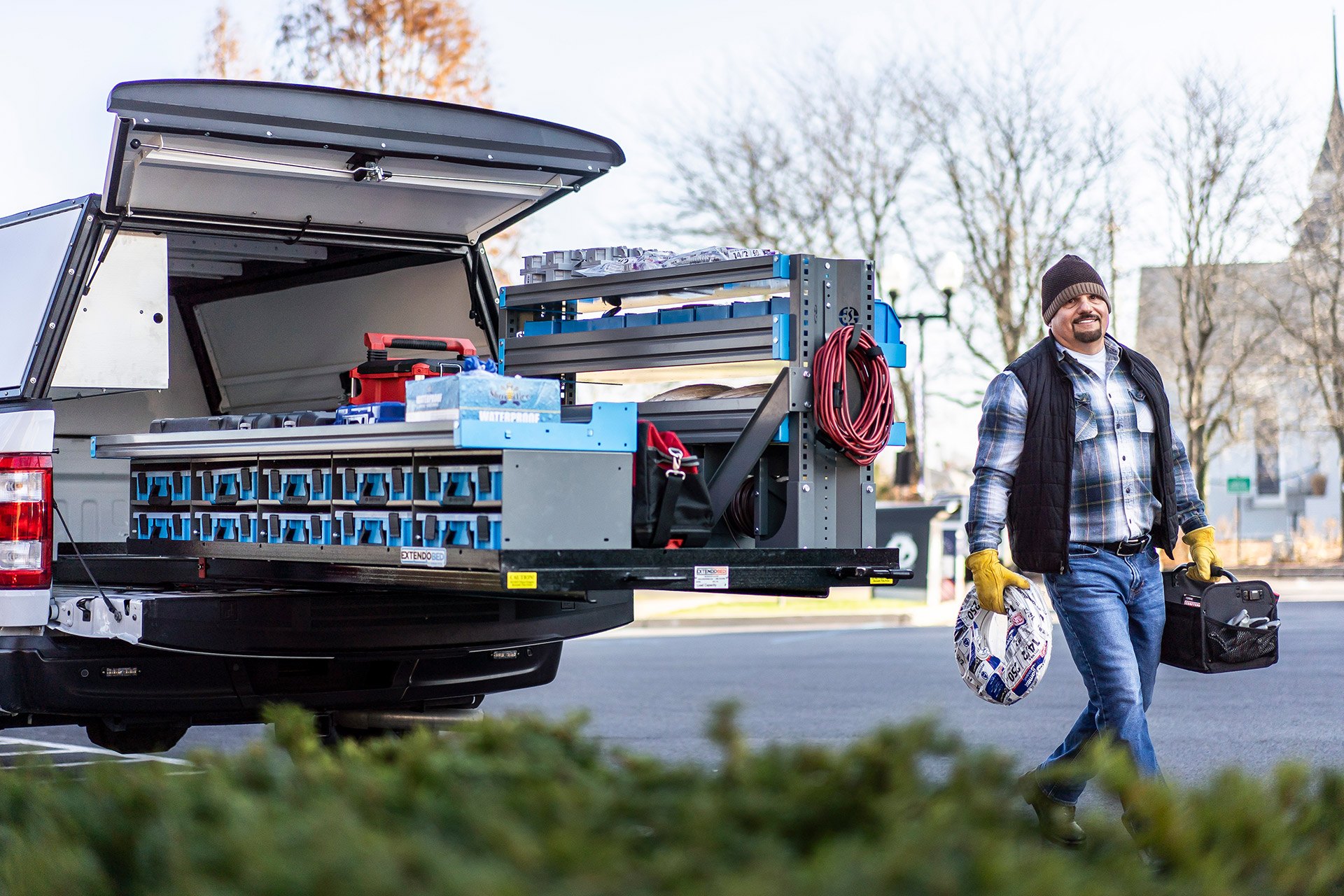 Let your work current flow with no resistance thanks to the Extendobed trade package for Electrician professionals! Built for you, this truck package keeps a place for all the hardware, conduits, and cables you need for the job, but lets you get to them quickly thanks to our convenient Extendobed slideout and storage shelving.