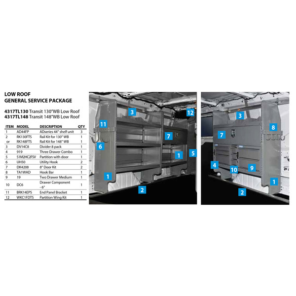 This General Service Interior is designed to fit the 148" wheelbase, low roof Ford Transit.