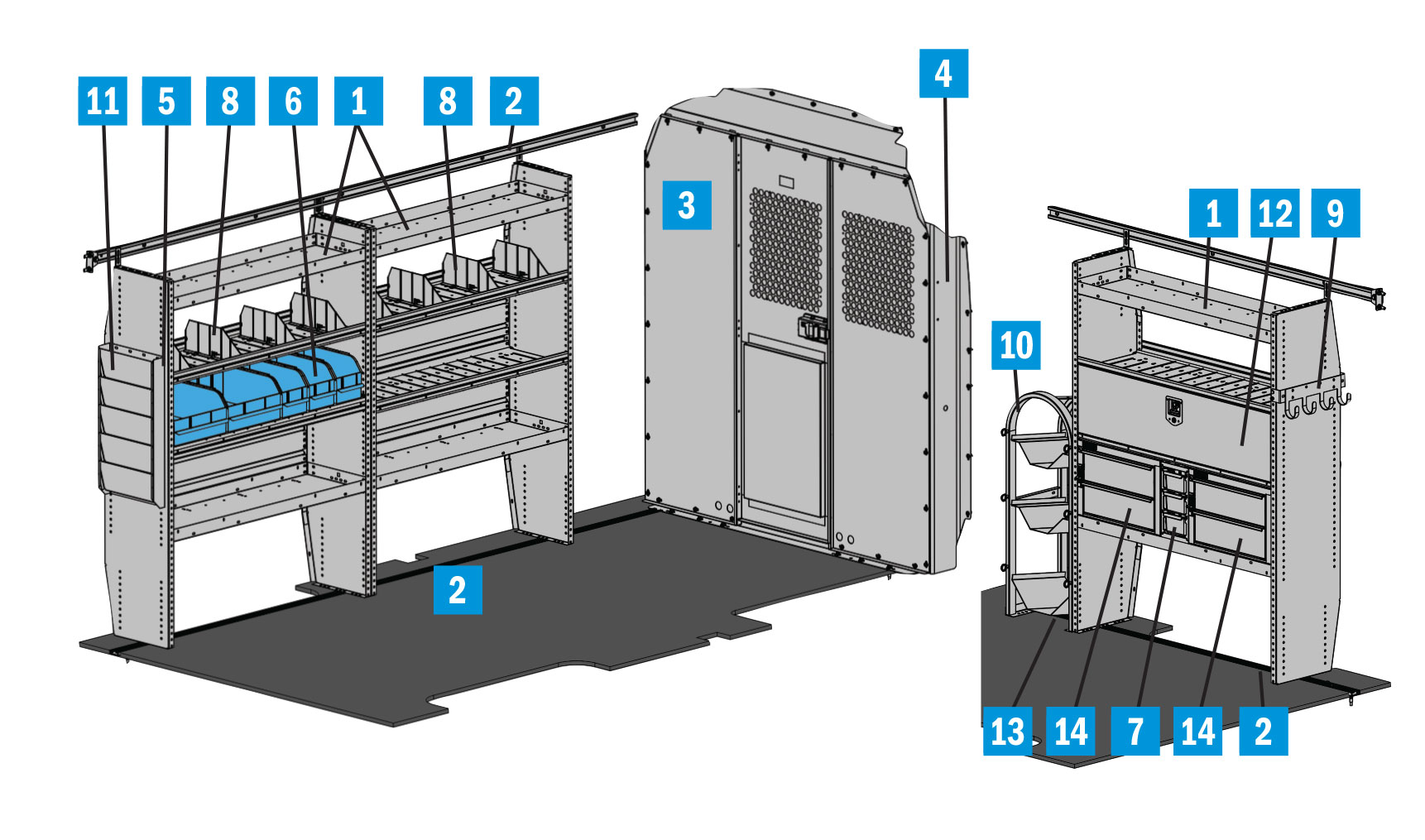 This Plumbing, Heating and A/C Repair Interior is designed to fit the 130" wheelbase, medium roof Ford Transit.