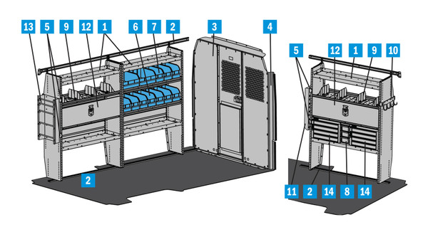 This Electrical Contractor Interior is designed to fit the 148" wheelbase, high roof Ford Transit.