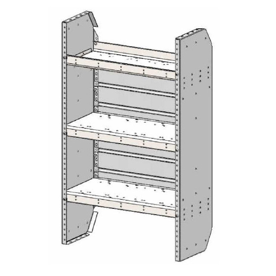 Adjustable shelving unit with solid end panels and adjustable shelves. The adjustable shelves can be installed with the shelf lip up for cargo retention or with the shelf lip down to allow the installation of accessories like drawer units and door kits.