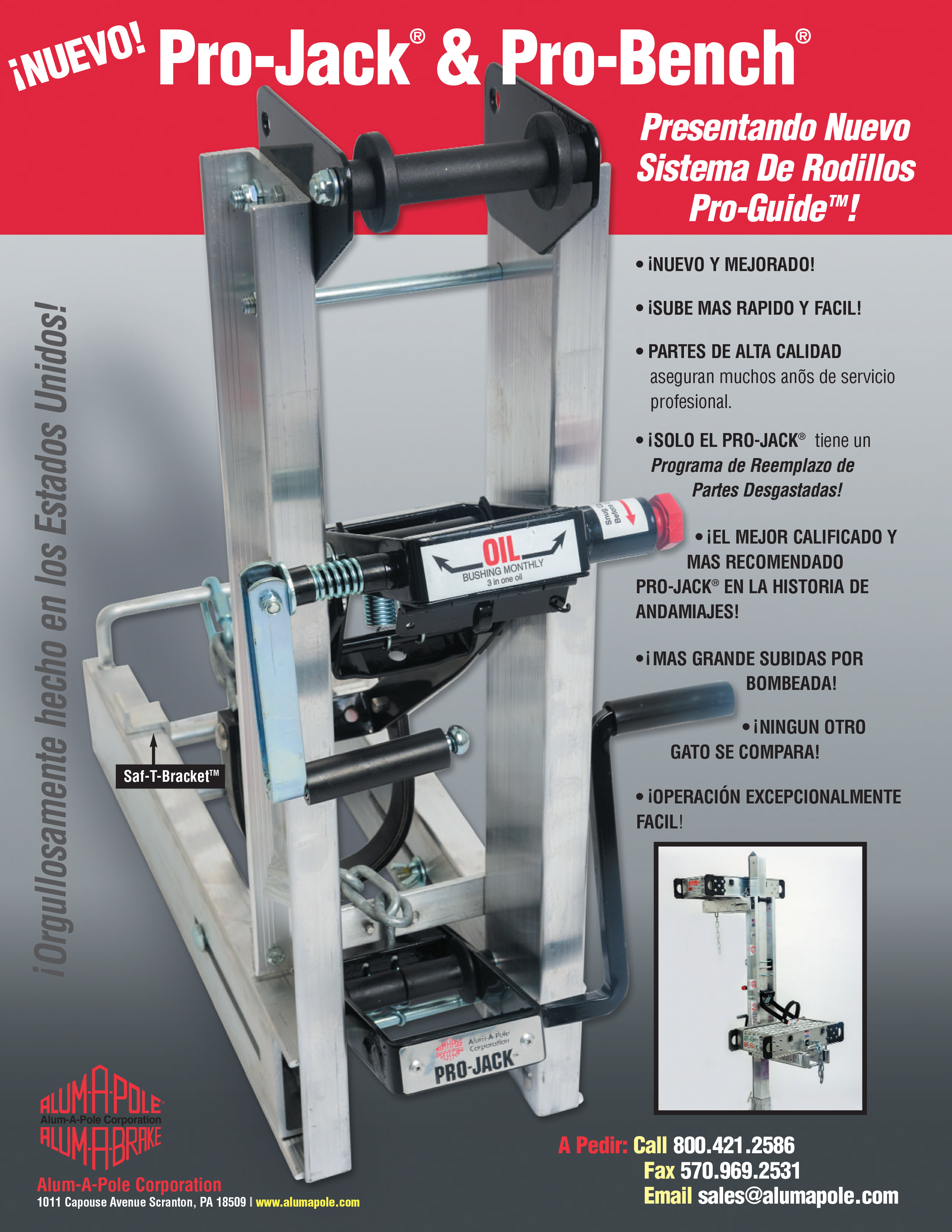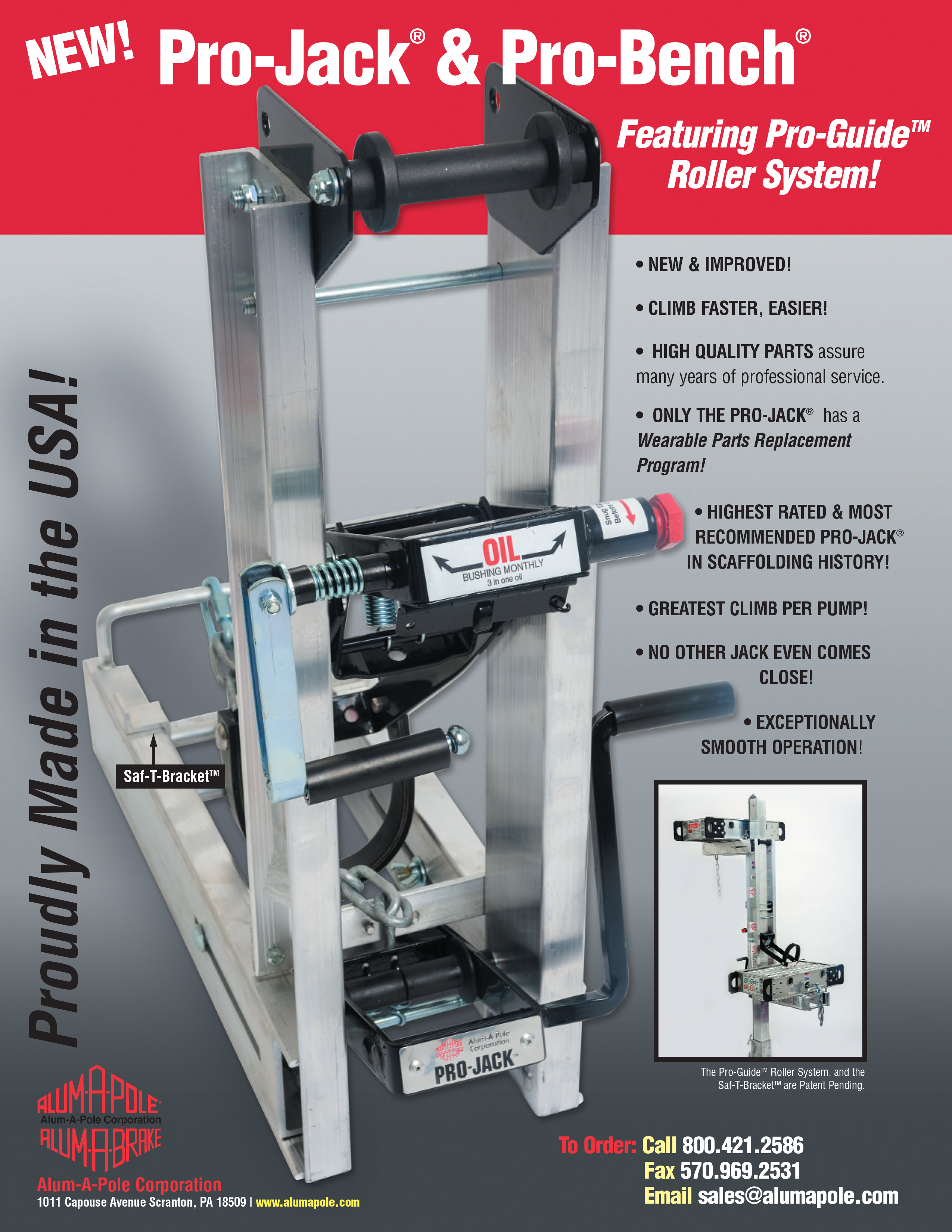 Alum-A-Pole Corporation proudly presents the first telescopic aluminum-framed pump jack. Residential, commercial and industrial omni-capability has been achieved at last. Combine this product with the rest of our scaffolding system and you will have a totally rugged scaffolding package. By following OSHA regulations, you may go up to a 50' shoulder working height when Alum-A-Pole products are used. The Pro-Jack is conveniently lockable anywhere up to 27". Load tested to 2,500 lbs. Centralizers help to provide a silken operation. Innovative parts assure many years of professional service. Exclusive 27" wide staging capability on both Pro-Jack and Pro-Bench. Numerous mechanical advantages provide unequalled lifting capability in the pump-jack industry.