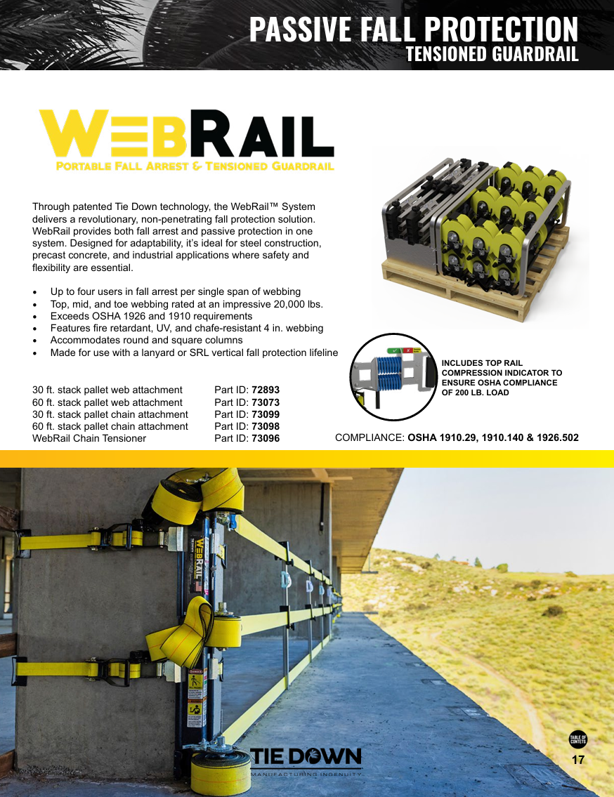 Quick view Tie Down Engineering Tie Down 72893 30 ft. WebRail Kit - Portable Fall Arrest & Tensioned Guardrail System $5,022.00 Tie Down 72893 30 ft. WebRail Kit - Portable Fall Arrest & Tensioned Guardrail System Product Description Tie Down's 30 ft. WebRail represents a revolutionary advancement in fall protection due to its patented technology that offers both fall arrest...