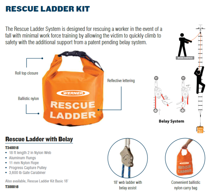 Quick view Werner Fall Protection Werner T300018 Rescue Ladder Kit, Basic, 18' $271.76 Werner T300018 Rescue Ladder Kit, Basic, 18' The T300018 Rescue Ladder System is designed for rescuing a worker in the event of a fall with minimum work force training. The system is simple to deploy using the existing or temporary anchor point...