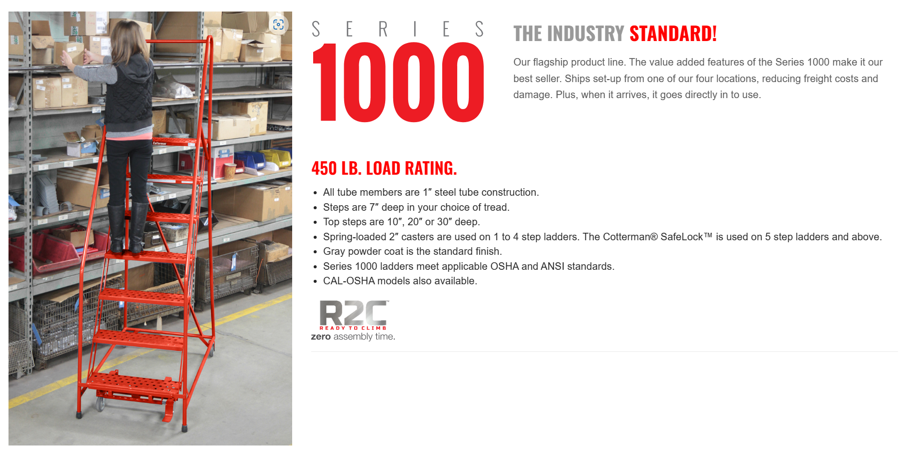 Quick view Cotterman Cotterman Series 1000 Rolling Ladder / 24" Tread Width / 59 Degree Climb Angle / A1 Tread $0.00 Cotterman Series 1000 Rolling Ladder / 24" Tread Width / 59 Degree Climb Angle / 10" Top Step / A1 Tread Additional Colors and Options are available - Please call us at 800-833-0800 for pricing and availability.