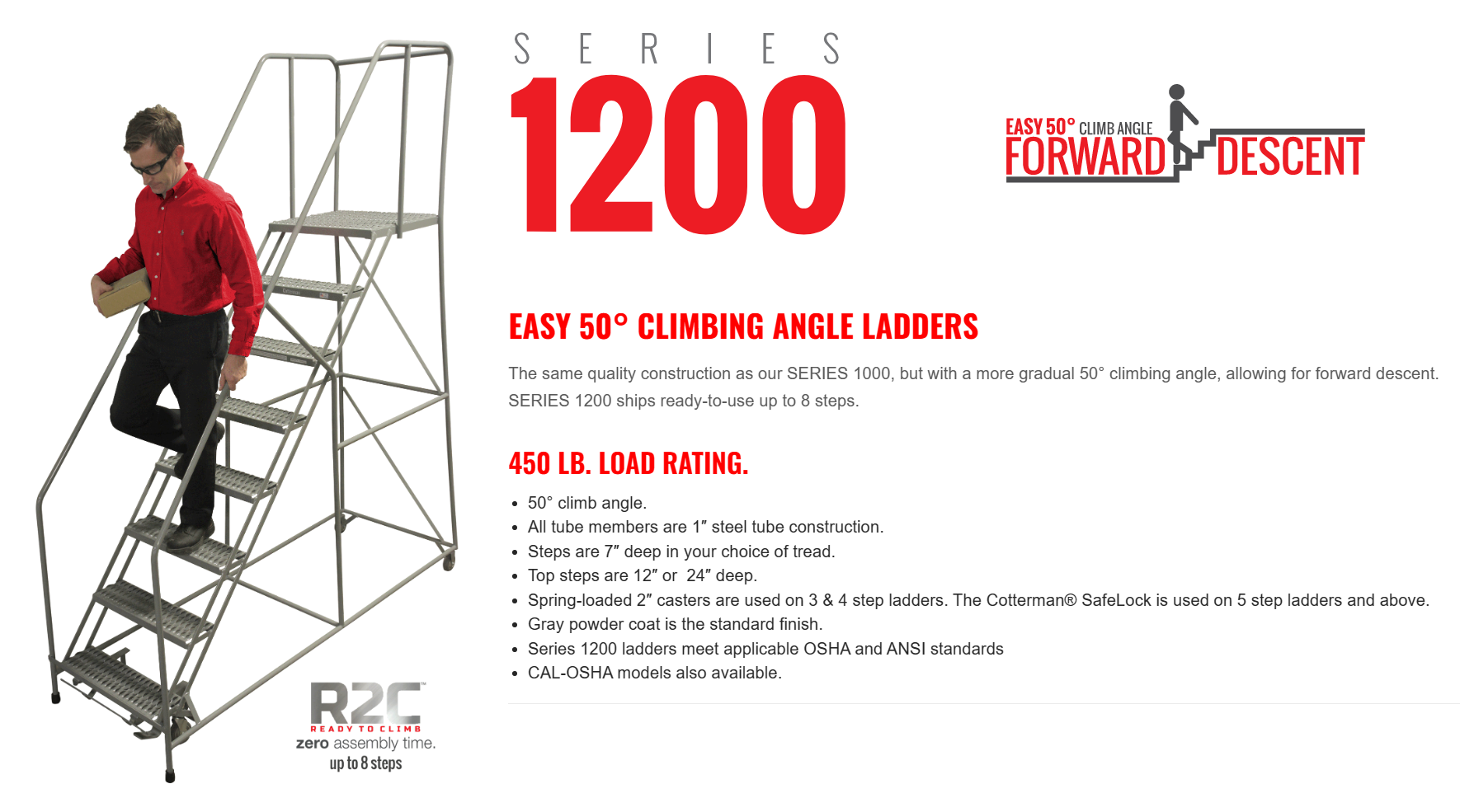 Quick view Cotterman Cotterman Series 1200 Rolling Ladder / 16" Tread Width / 50 Degree Climb Angle / A1 Tread $0.00 Cotterman Series 1200 Rolling Ladder / 16" Tread Width / 50 Degree Climb Angle / 10" Top Step / A1 Tread Additional Colors and Options are available - Please call us at 800-833-0800 for pricing and availability.