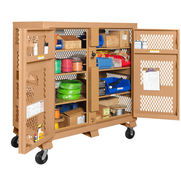 The Model 139-MT Tool Kage® Rolling cabinet features all new 16g diamond punched steel panels allowing clear visibility of the cabinet contents without compromising security. The 139-MT Cabinet measures 60 inches long, 30 inches wide, and has a capacity of 59.4 cu ft. This upright cabinet features full-width shelves and offers at-a-glance easy access for tools, equipment and supplies. NOTE: Casters not included.