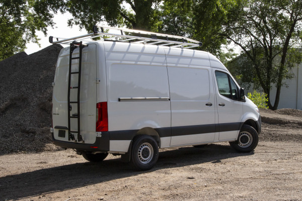 The rear door access ladder provides easy, safe access to items stored on the cargo van roof. Users can easily maintain the standard three points of contact when climbing or descending this ladder. It securely attaches to the cargo van rear door without drilling thereby avoiding any damage to the bodywork and maintaining the vehicle’s integrity. Its lightweight, corrosion-resistant aluminum construction is designed to last. Available in standard bright anodized aluminum or optional black anodized aluminum finish – not only does this access ladder promote safety, its trendy design provides a professional image to fleets or users of any kind.