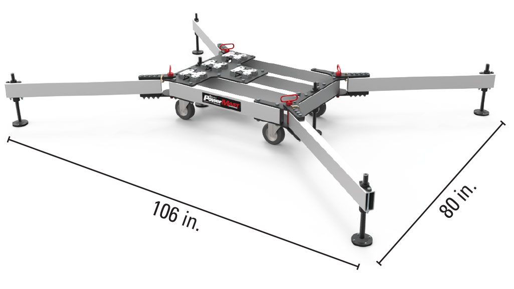 The PowerMast freestanding base allows three mast sections to be mounted as a rigid column, allowing ample support without the need of wall support.
