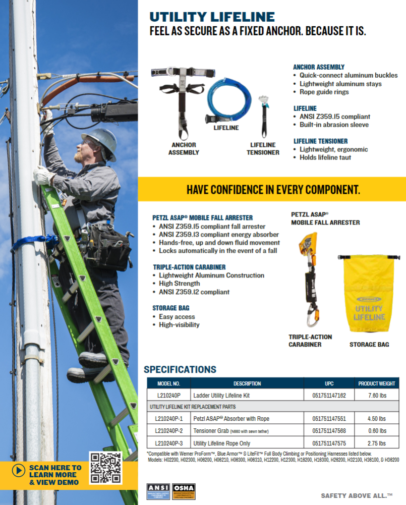 Quick view Werner Fall Protection Werner L210240P Utility Lifeline Kit / for use with Ladders $849.70 Werner L210240P Utility Lifeline Kit / for use with Ladders Features 50-foot working range 11 mm polyester lifeline Minimum Breaking Strength (MBS): 5,000 pounds Self-trailing, automatic fall arrestor (Petzl ASAP) Simple installation, anchors...