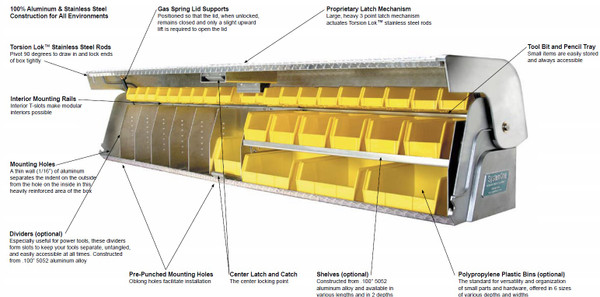 Full Access® truck tool boxes provide complete accessibility to an interior that offers unique storage and organization options. Organization means efficiency and efficiency means money, and that’s especially true in today’s competitive business environment. With .100” bright aluminum tread plate, 3/16” (.188”) cast aluminum ends, and 3/4" stainless steel pivot pins set in bronze bearings, Full Access® truck toolboxes are the toughest and heaviest aluminum truck boxes made anywhere. The design of a Full Access® tool box gives you total access to the interior. Having a tool compartment with full accessibility opens up a world of versatility, organization and efficiency. Tall vertical aluminum dividers are available for our Full Access® tool boxes. Instead of piling tools on top of each other, they are stored side by side in separate, fully accessible compartments, cords and all. Shelves are available and can be positioned at seven different levels. And, at last, plastic polypropylene bins (the standard in organization of small parts for all industries) can be configured in three completely accessible tiers inside the box. There’s even a small, full length built in tray in the upper rear of the tool box for pencils, pens, drill and screw driver bits – the small items that invariably disappear under the heap of tools in conventional boxes. This truck tool box has been well designed and is made to work for you.