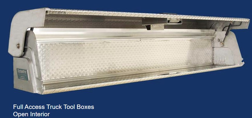 Full Access® truck tool boxes provide complete accessibility to an interior that offers unique storage and organization options. Organization means efficiency and efficiency means money, and that’s especially true in today’s competitive business environment. With .100” bright aluminum tread plate, 3/16” (.188”) cast aluminum ends, and 3/4" stainless steel pivot pins set in bronze bearings, Full Access® truck toolboxes are the toughest and heaviest aluminum truck boxes made anywhere. The design of a Full Access® tool box gives you total access to the interior. Having a tool compartment with full accessibility opens up a world of versatility, organization and efficiency. Tall vertical aluminum dividers are available for our Full Access® tool boxes. Instead of piling tools on top of each other, they are stored side by side in separate, fully accessible compartments, cords and all. Shelves are available and can be positioned at seven different levels. And, at last, plastic polypropylene bins (the standard in organization of small parts for all industries) can be configured in three completely accessible tiers inside the box. There’s even a small, full length built in tray in the upper rear of the tool box for pencils, pens, drill and screw driver bits – the small items that invariably disappear under the heap of tools in conventional boxes. This truck tool box has been well designed and is made to work for you.