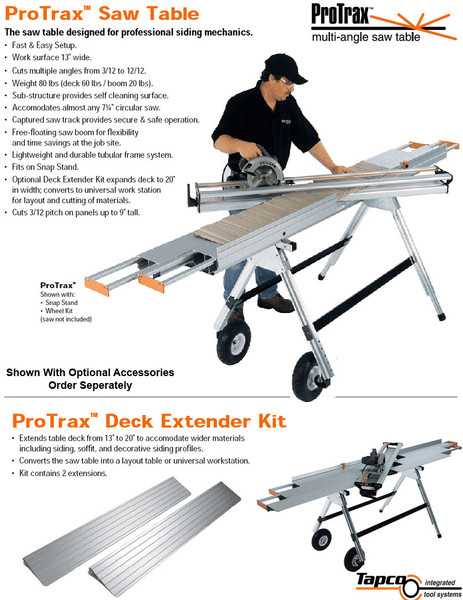Tapco Siding Tools ProTrax Saw Table #11850. Fast & Easy Setup. Cuts multiple angles from 3/12 to 12/12. Weight estimated at 82 lbs. Sub-structure provides self cleaning surface. Accommodates almost any 7 1/4" circular saw. Captured saw track provides secure and safe operation. Sliding boom for flexibility and time saving at the job site. 4-piece telescoping deck. Fits on new Snap Stand. Table extension expands deck up to 19" W; converts to universal work station for layout and cutting of materials.
