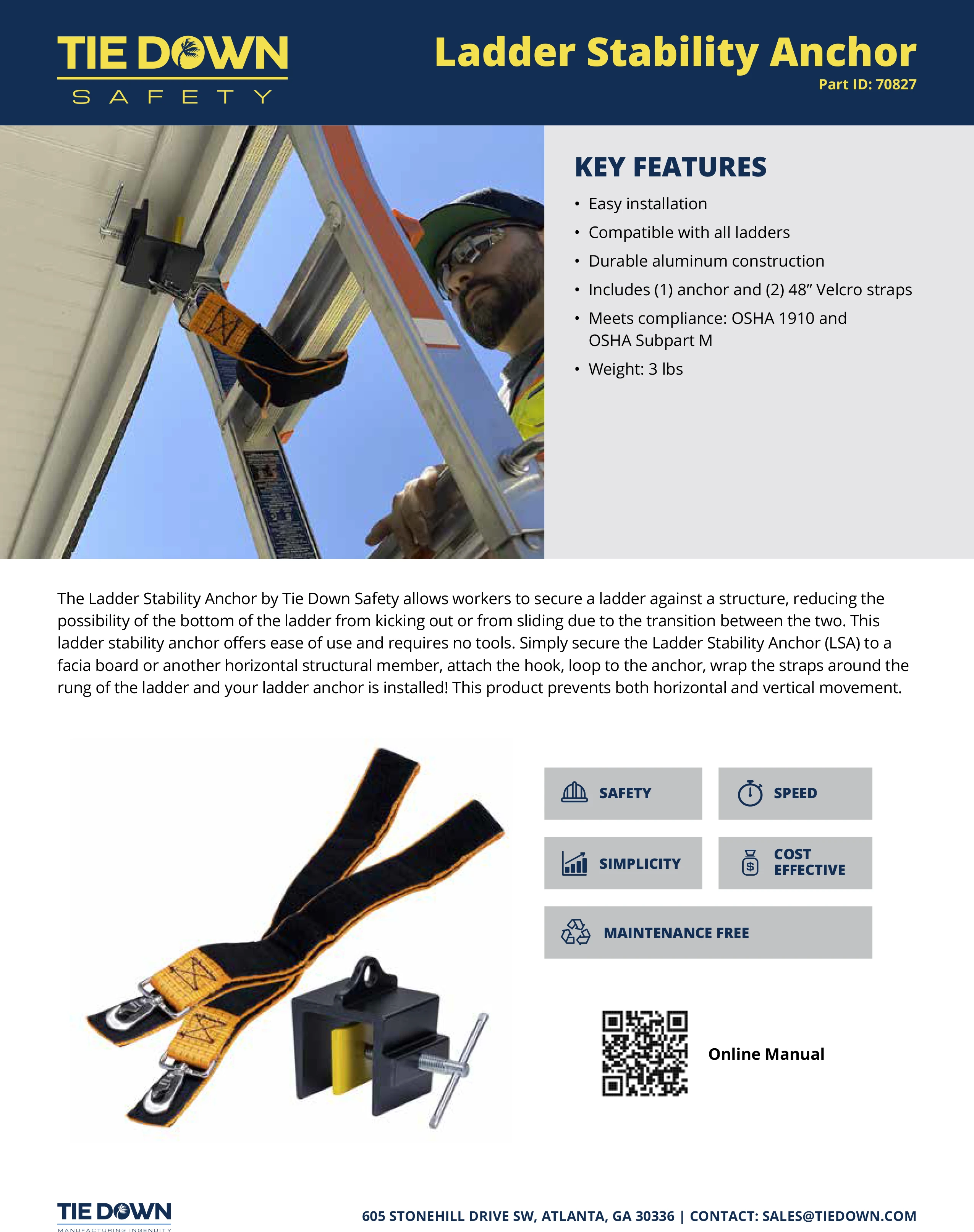Tie Down's Ladder Stability Anchor allows workers to secure a ladder against a structure, reducing the possibility of the bottom of the ladder from kicking out or from sliding due to the transition between the two. This ladder stability anchor offers ease of use and requires no tools. Simply secure the Ladder Stability Anchor (LSA) to a facia board or another horizontal structural member, attach the hook, loop to the anchor, wrap the straps around the rung of the ladder and your ladder anchor is installed! This product prevents both horizontal and vertical movement.