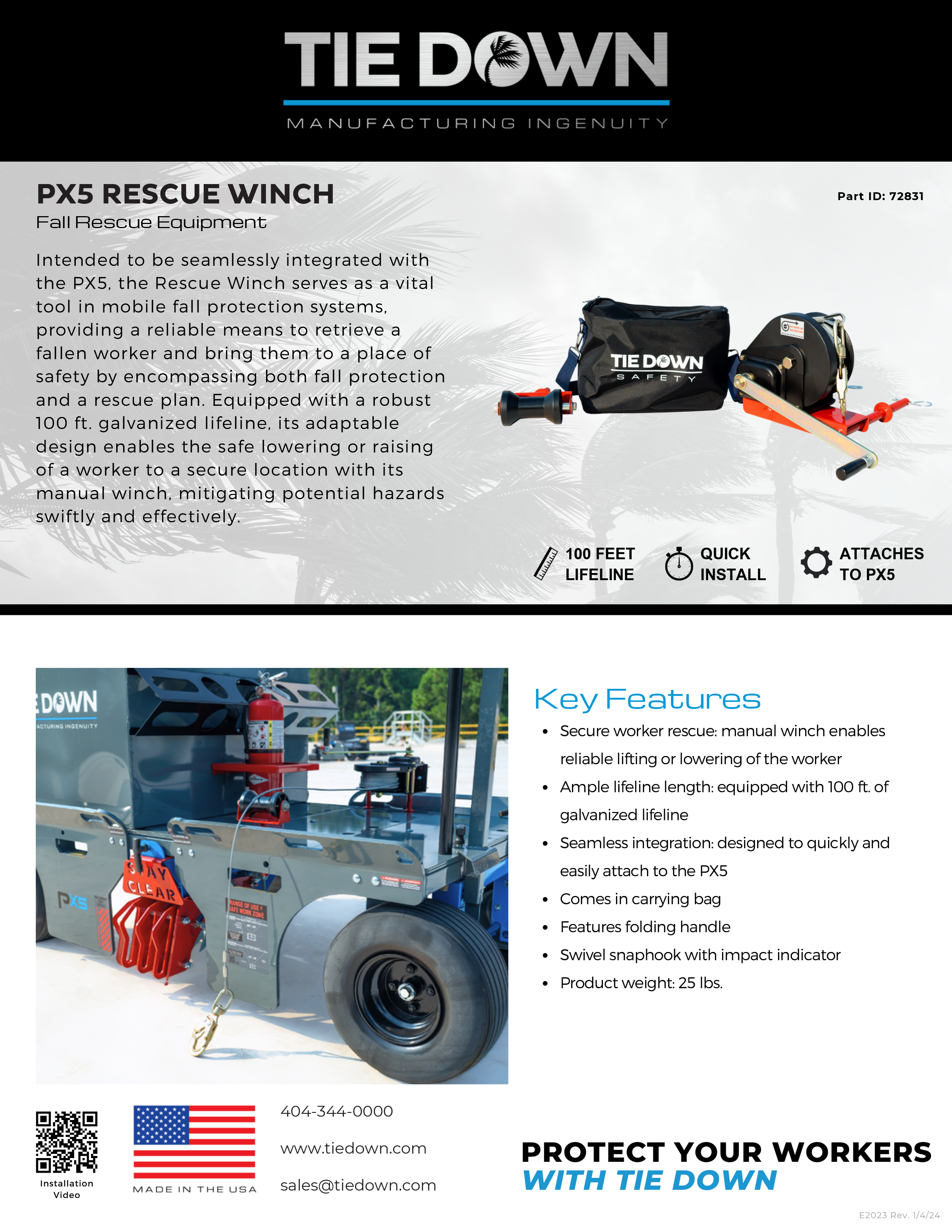 Tie Down's PX5 Rescue Winch Assembly, you have the confidence and capability to rescue fallen workers securely and efficiently. Designed as an accessory tool to rescue a fallen worker securely, it enables precise control and reliable lifting or lowering of the worker to safety with its manual winch. Equipped with 100 feet of galvanized lifeline, this assembly provides sufficient length to handle rescue operations effectively whether it's lowering or raising the worker. The PX5 Rescue Winch Assembly is designed to quickly and easily attach to the PX5 Mobile Fall Protection System.