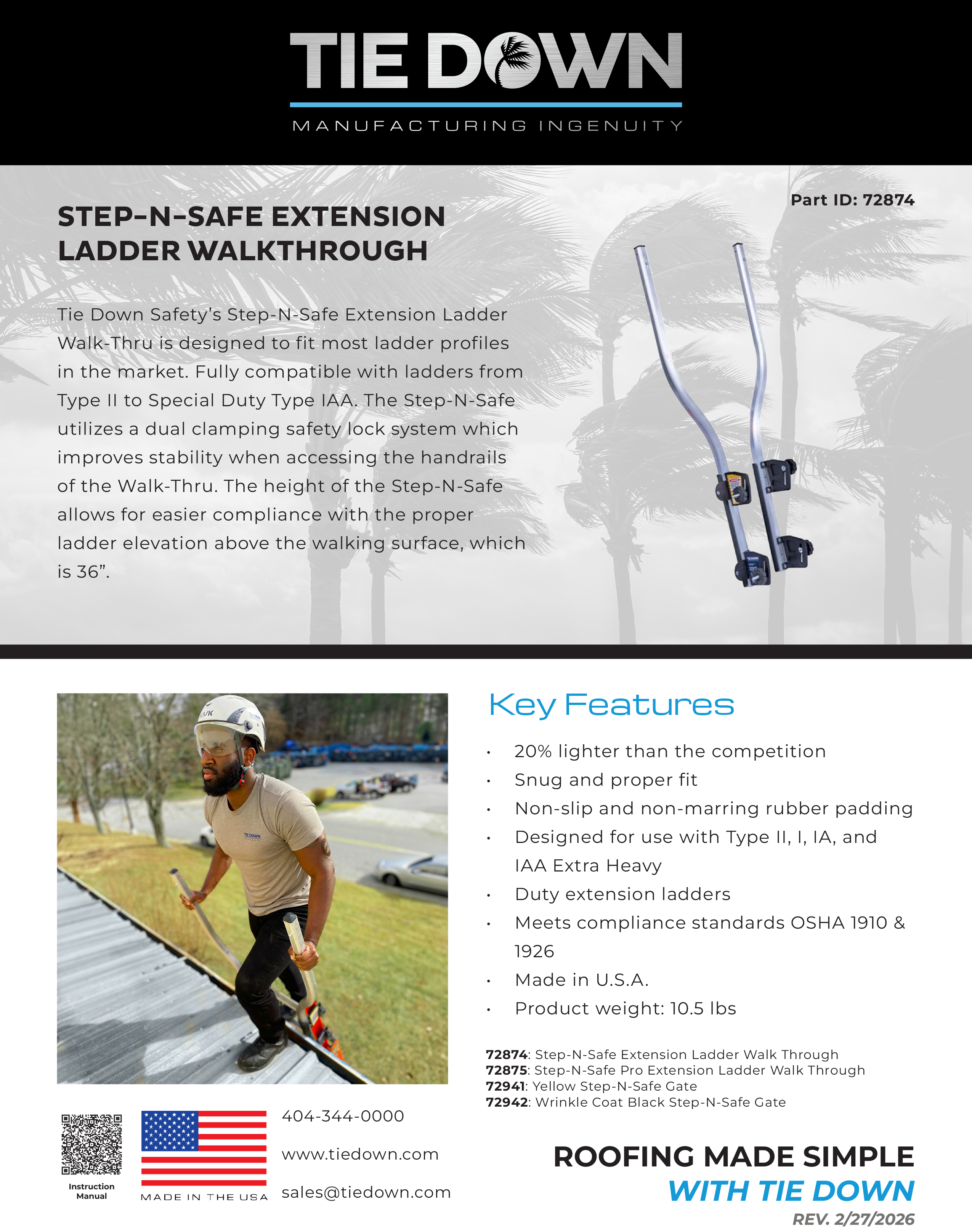 Tie Down's Step-N-Safe Extension Ladder WalkThru is designed to fit most ladder profiles in the market. Fully compatible with ladders from Type II to Special Duty Type IAA. The Step-N-Safe utilizes a dual clamping safety lock system which improves stability when accessing the handrails of the Walk-Thru. The height of the Step-N-Safe allows for easier compliance with the proper ladder elevation above the walking surface, which is 36”. The Step-N-Safe also has a wide base with non-skid rubber padding that increases the contact area on the work surface while transitioning to an elevated walking surface. The non-skid rubber padding also protects against the damaging of gutters, etc. The Tie Down StepN-Safe is compliant OHSA 1910 and 1926
