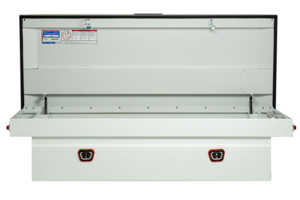 Introducing the re-designed Weather Guard Saddle Box, featuring One Key Simplicity, Improved High Security Locking System. The Model 116-X-04 is an extra wide steel truck tool box for full size trucks and is powder coated in a white ARMOR TUF® finish ensuring years of dependability. The box features the new push button lock that can code multiple boxes on a truck or entire fleet to the same key. The improved high security locking system provides unmatched protection.