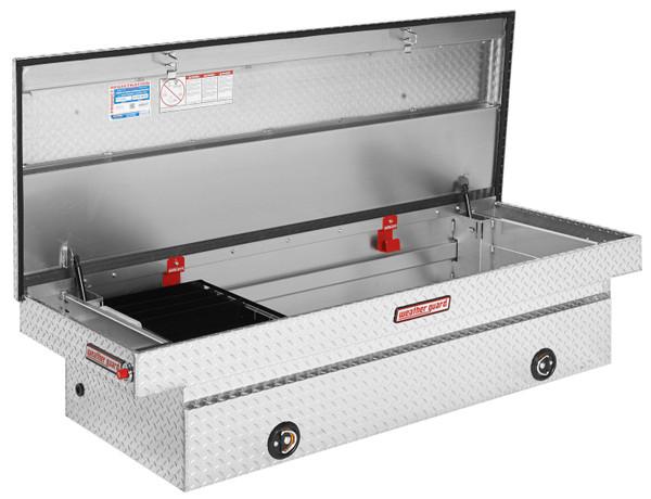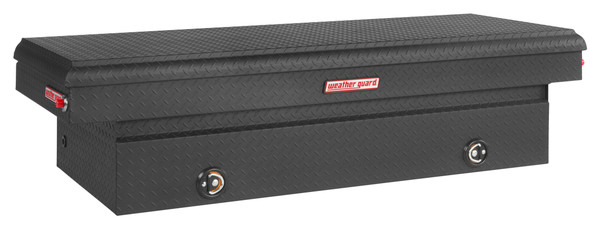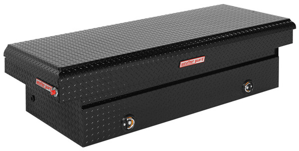 Introducing the re-designed Weather Guard Saddle Box, featuring One Key Simplicity, Improved High Security Locking System. The Model 117-X-04 is an extra wide aluminum truck tool box for full size trucks. The box features the new push button lock that can code multiple boxes on a truck or entire fleet to the same key. The improved high security locking system provides unmatched protection.