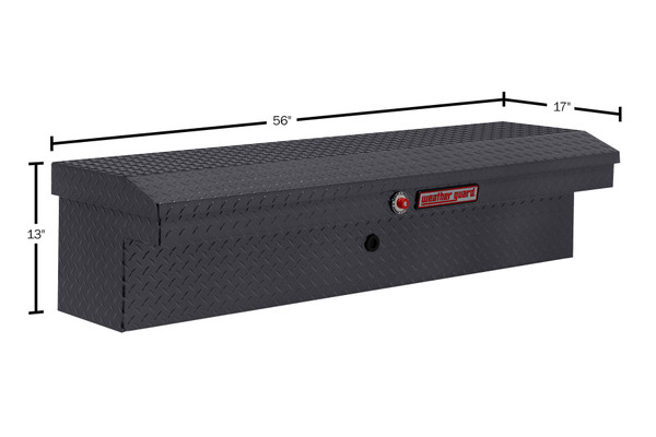 Introducing the re-designed Weather Guard Lo-Side Box, featuring One Key Simplicity, Improved High Security Locking System. The Model 178-X-04 is a 56" low profile aluminum truck tool box for full size and compact trucks. The box features the new push button lock that can code multiple boxes on a truck or entire fleet to the same key. The improved high security locking system provides unmatched protection.