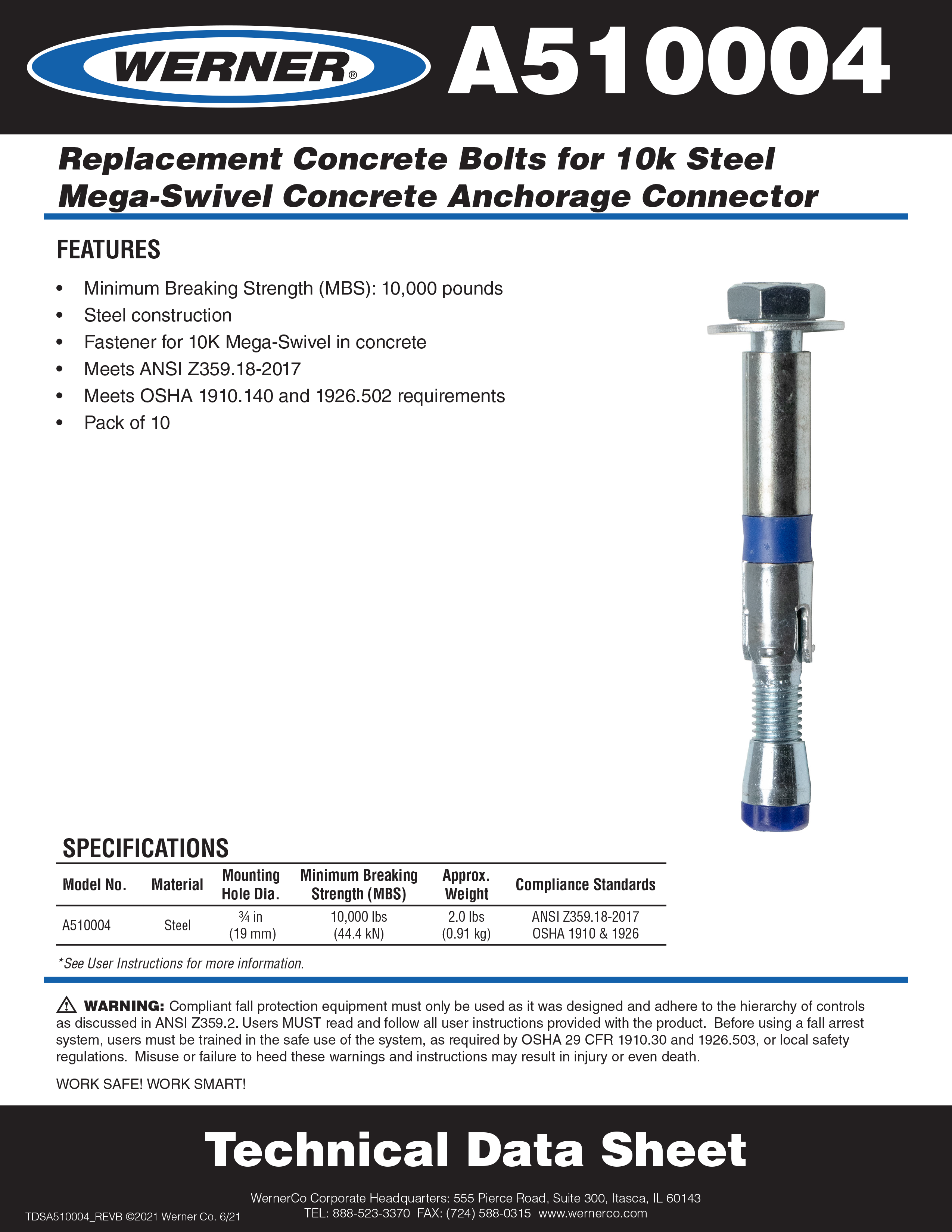 The Werner A510004 Steel Replacement Concrete Bolts are to be used with the 10K Steel Mega-Swivel for concrete applications.