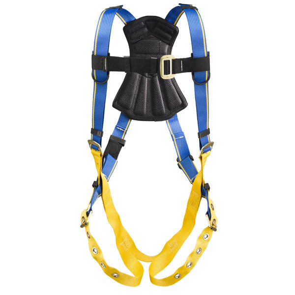 Werner Blue Armor 1000 harnesses deliver the right combination of safety features, comfort, and durability for the professional worker. Unique wear indicating webbing and impact indicators allow for easy inspection. They feature 5-point adjustments for optimal fit, lightweight hardware and pads, and bright colors for worker visibility on the jobsite. The back pad is large enough to protect the user's back, padded to absorb sweat and feel comfortable, and designed to prevent tangling when donning the harness. The rear dorsal D-ring is made from high quality forged alloy steel for strength and durability. Slotted pass-through buckles on the leg and chest straps fasten without twisting.
