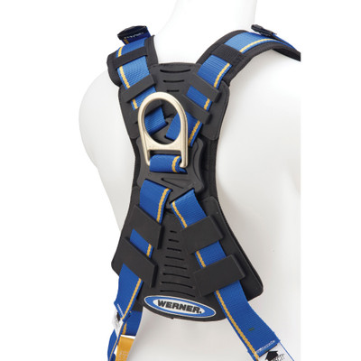Werner Blue Armor 2000 harnesses are designed and manufactured for the most demanding applications and the most serious professional user. Unique wear indicating webbing and impact indicators allow for easy inspection. They feature 5-point adjustments for optimal fit, lightweight hardware and pads, and bright colors for worker visibility on the jobsite. The back pad is large enough to protect the user's back, padded to absorb sweat and feel comfortable, and designed to prevent tangling when donning the harness. Shoulder pads provide additional user comfort. The rear dorsal D-ring is made from high quality forged alloy steel for strength and durability. Chest D-ring for climbing applications. Quick connect chest buckle. Tongue buckle leg straps are simple, fast, easy, and ideal when more than one worker could use the same harness.