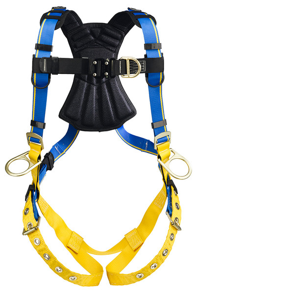 Werner Blue Armor 2000 harnesses are designed and manufactured for the most demanding applications and the most serious professional user. Unique wear indicating webbing and impact indicators allow for easy inspection. They feature 5-point adjustments for optimal fit, lightweight hardware and pads, and bright colors for worker visibility on the jobsite. The back pad is large enough to protect the user's back, padded to absorb sweat and feel comfortable, and designed to prevent tangling when donning the harness. Shoulder pads provide additional user comfort. The rear dorsal D-ring is made from high quality forged alloy steel for strength and durability. Hip D-rings for positioning, chest D-ring for climbing applications. Quick connect chest buckle. Tongue buckle leg straps are simple, fast, easy, and ideal when more than one worker could use the same harness.