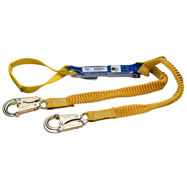 • Elastic webbing contracts lanyard length from 6 ft to 4 ft to reduce the hazards of tripping, dragging, and snagging
