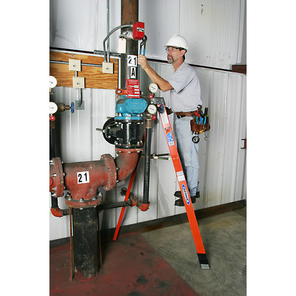 The FTP6200 series of tripod Step Ladders feature a duty rating of 300 pounds. The single rear rail allows the tripod ladder to go where other ladders can't making working in tight spaces easy. The convenient spreader handle design improves setup and makes these ladders easy to transport. The front section is fully braced and the molded external rail shields help protect against abrasion and rail damage. The slip-resistant, Traction-Tredå¨ steps are double riveted. Back-up plates reinforce all top connectors. Fiberglass rails are non-conductive for working near electricity.