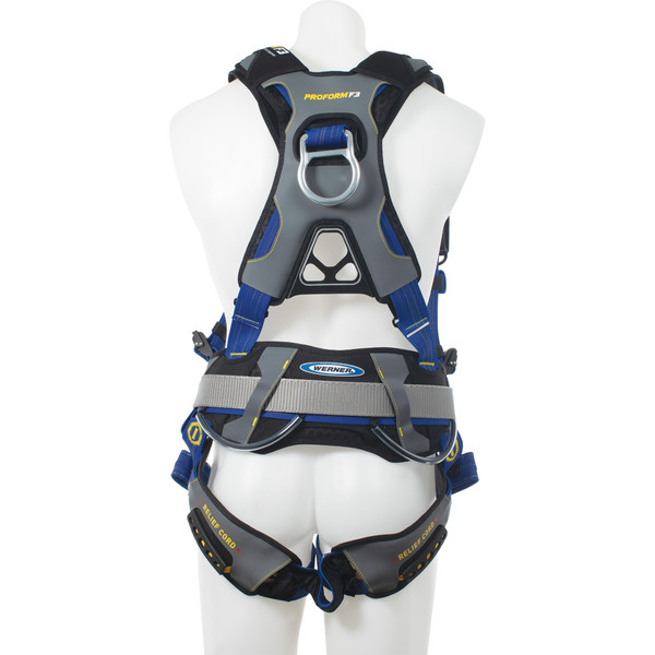 The Werner ProForm™ F3 H032XXS Series Construction Fall Protection Harness with Tongue Buckle Legs is athletically styled and constructed with lightweight materials to deliver maximum comfort and unrelenting safety performance. In the event of a fall, simply pull the patented Relief Cords to deploy the built-in seat and achieve the Gravity Override position reducing the potential hazards of suspension trauma. ProForm™ F3 delivers Function, Fit and Freedom. Functional features are the post-fall performance with the relief cords and the new dual back pad system, which can be repositioned after a fall to reduce pressure on the clavicle. New WebAlert™2 adds a weather resistant coating to inspectable webbing. The addition of an integrated self-retracting lifeline bumper protects the lower back when wearing personal SRLs. Addition of gear loops allow connection of tool lanyards to secure tools. Fit features include quick connect buckles with indicator and new roll down torso web keepers for convenient storage of excess web. Freedom features are the lightweight material and design throughout the fall protection harness, minimizing contact points to promote airflow and maximize comfort.