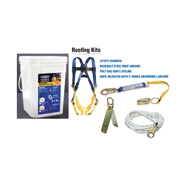 The Werner K111201 50ft Basic Roofing Kit with Pass-thru Buckle Harness contains all of the fall protection products necessary for safe working and code compliance for roofing applications. The system is easy to install and use on a variety of roof pitches. Kit includes a BaseWear harness with pass-through buckle leg straps, reusable roof anchor, 50ft Poly-dac rope, and a manual rope grab with an integrated 3ft shock absorbing lanyard, packaged in a waterproof bucket.