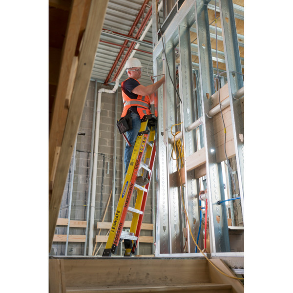 The L7300 Series Fiberglass Leaning Ladder is ideal for the professional. With a duty rating of 375 pounds, it features the LEANSAFE® ladder top that secures tools and accessories, and is uniquely designed to securely lean against flat wall surfaces, wall corners, poles, and wall studs and perform as a standard stepladder. LEANSAFE® ladders have a lower rear rail to front rail connection point allowing the user to get closer to the work when in stepladder mode. Leaning a standard step ladder is not an option on a jobsite, so we designed the LEANSAFE® ladders with a two color design and highly visible LEANSAFE® logos to make this ladder easily distinguishable from a standard stepladder. Leaning a ladder safely requires that the rear rail is latched to the front rail. Werner’s patent pending single latch design stays engaged when needed, and is centrally located to easily open and close. Anchoring the ladder is the EDGE360® bracing to protect the bottom of the ladder. LEANSAFE® ladder front feet have curved non-marring rubber foot pads that maximize the surface area in both the step ladder and leaning ladder modes. Available in 4, 6, 8, 10, and 12 foot heights. Built with a 375 pound duty rating this L7300 series ladder provides the professional contractor a single ladder that works as an improved standard stepladder and leaning ladder to safely get closer to your work.
