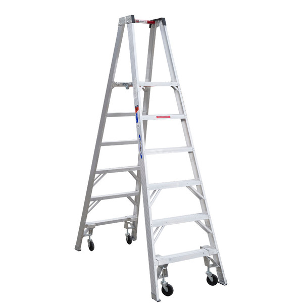 The PT370-4C Aluminum STOCKR'S LADDER includes 4 casters and have a duty rating of 300 pounds per side. They feature a large platform that provides a secure and comfortable work area. The PINCH-PROOF™ platform is designed for easy opening and closing. TRACTION-TRED® slip-resistant steps are on the front and rear sections making these ladders ideal for one or two-person jobs. The heavy duty aluminum foot bracket secures the slip-resistant foot pad and protects the rail.